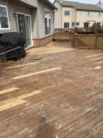 We can only do minor repairs, such as removing and replacing floor boards. We are not a construction company and cannot do any work that would require a permit to be acquired such as railings, steps and foundational work.